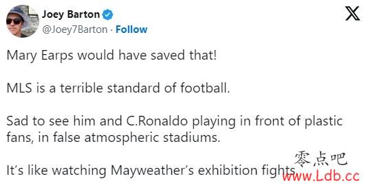 巴顿写道:“这球(英格兰女足国门)玛丽-厄普斯都能扑出来!大联盟的足球真的太差了,看到梅西和C罗在这些塑料球迷、罐头呼声的球场里踢球,真的很伤心,这就像看梅威瑟打表演赛一样。”