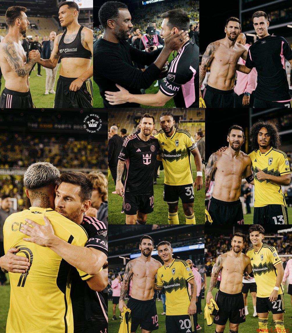 在比赛结束后,梅西与哥伦布机员队主教练以及多名球员进行合影。