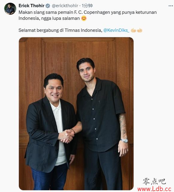 零点吧足球10月12日讯 印尼足协主席托希尔晒与哥本哈根后卫迪克斯合照,托希尔同时写道:与哥本哈根球员共进午餐,欢迎来到印尼国家队!