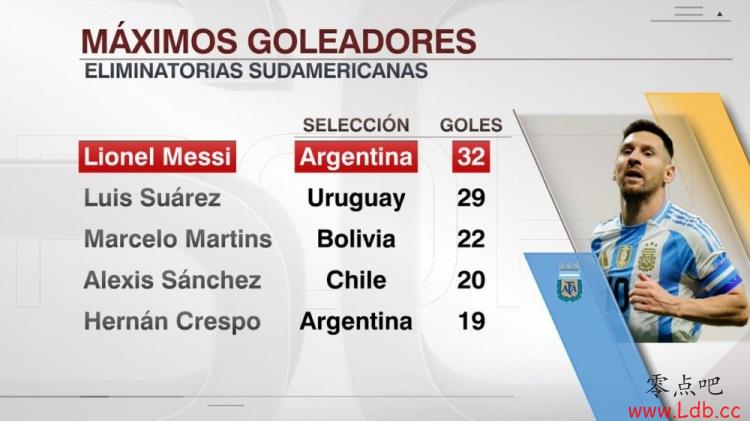 据ESPN统计,梅西已在南美世预赛中攻入32球,领跑赛事历史射手榜。