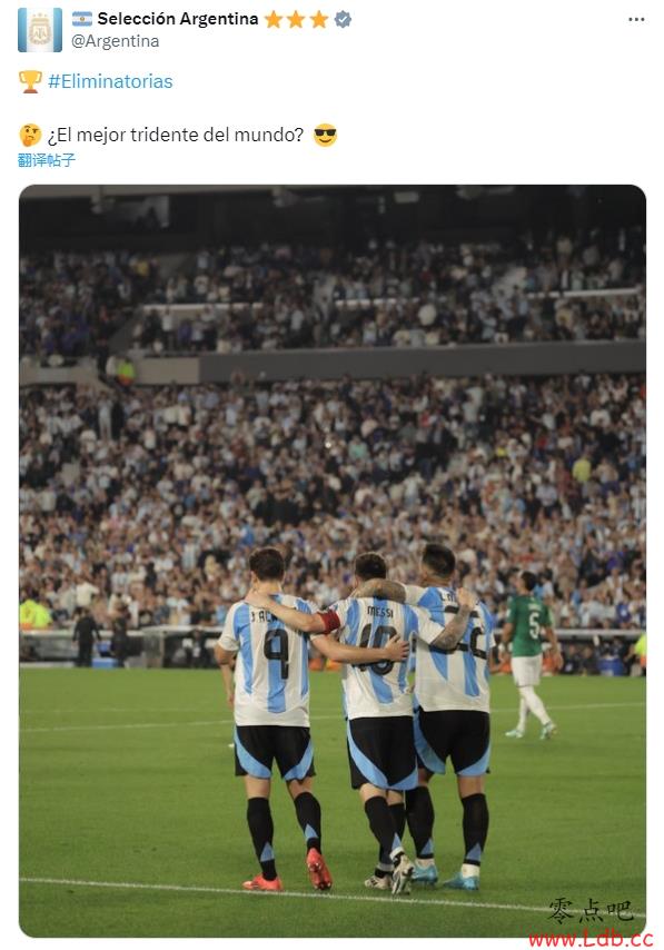 赛后,阿根廷国家队官推晒出梅西、劳塔罗、阿尔瓦雷斯三人勾肩搭背的照片,并发问:“??世界上最好的三叉戟???”