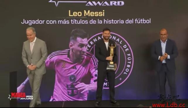 零点吧足球10月18日讯 马卡报在迈阿密主场致敬梅西,为梅西举行颁奖仪式颁发特别奖——马卡美国奖。这一奖项是致敬历史上冠军最多的球员梅西46冠。