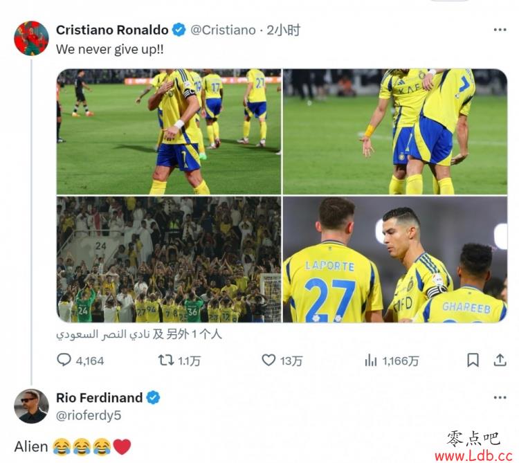 赛后C罗在社交媒体上庆祝胜利,他写道:“我们永不放弃!”