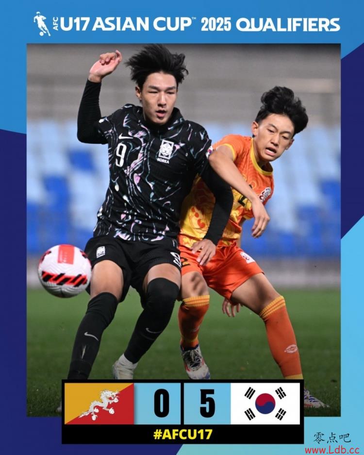 零点吧足球10月21日讯 U17亚洲杯预选赛C组,韩国队5-0大胜不丹迎来首胜。