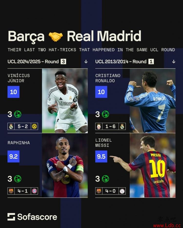 数据统计显示,这也是皇马和巴萨球员时隔11年后再次在同一轮欧冠戴帽: