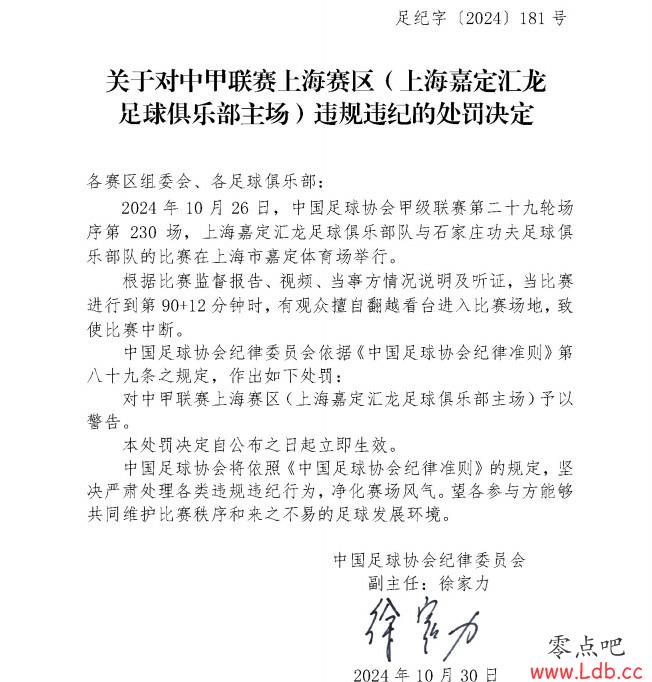 零点吧足球10月31日讯 中国足协官方消息,对中甲上海嘉定汇龙予以警告。