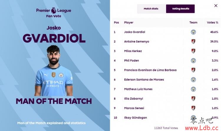 赛后,英超官方宣布,格瓦迪奥尔以40.6%得票率当选本场比赛的全场最佳球员。