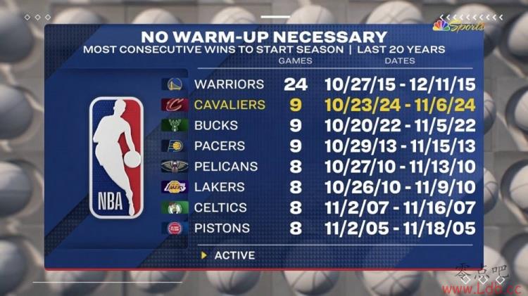 赛前转播方晒出数据,骑士目前开赛9连胜,这能排在NBA历史开季连胜场次数第二位,与22年雄鹿、13年步行者并列。