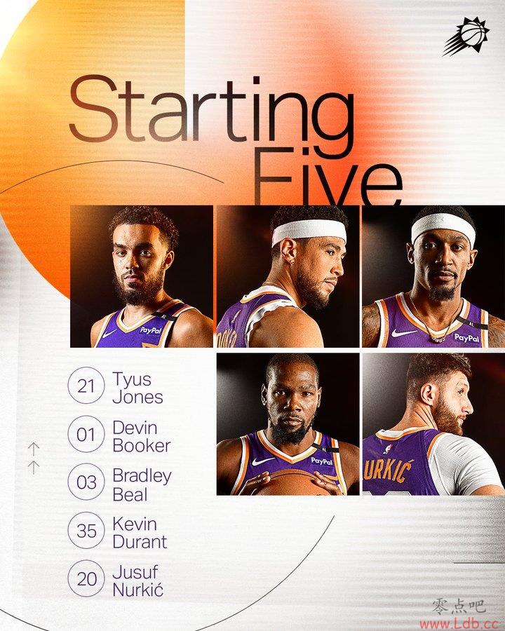 太阳队官方公布了本场比赛的首发阵容:杜兰特、布克、比尔、泰厄斯-琼斯、努尔基奇。