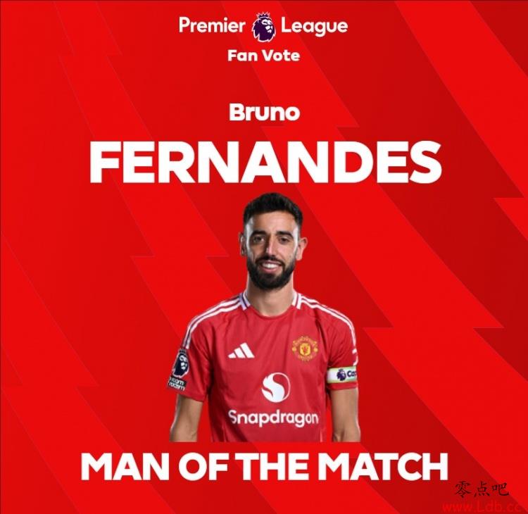 零点吧足球11月11日讯 官方消息,B费当选曼联3-0莱斯特城一战英超官方全场最佳。