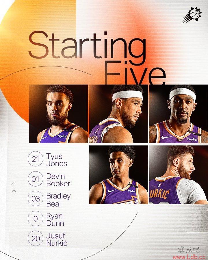 本场比赛,太阳的首发阵容为:泰厄斯-琼斯、布拉德利-比尔、德文-布克、瑞安-邓恩和尤素福-努尔基奇。