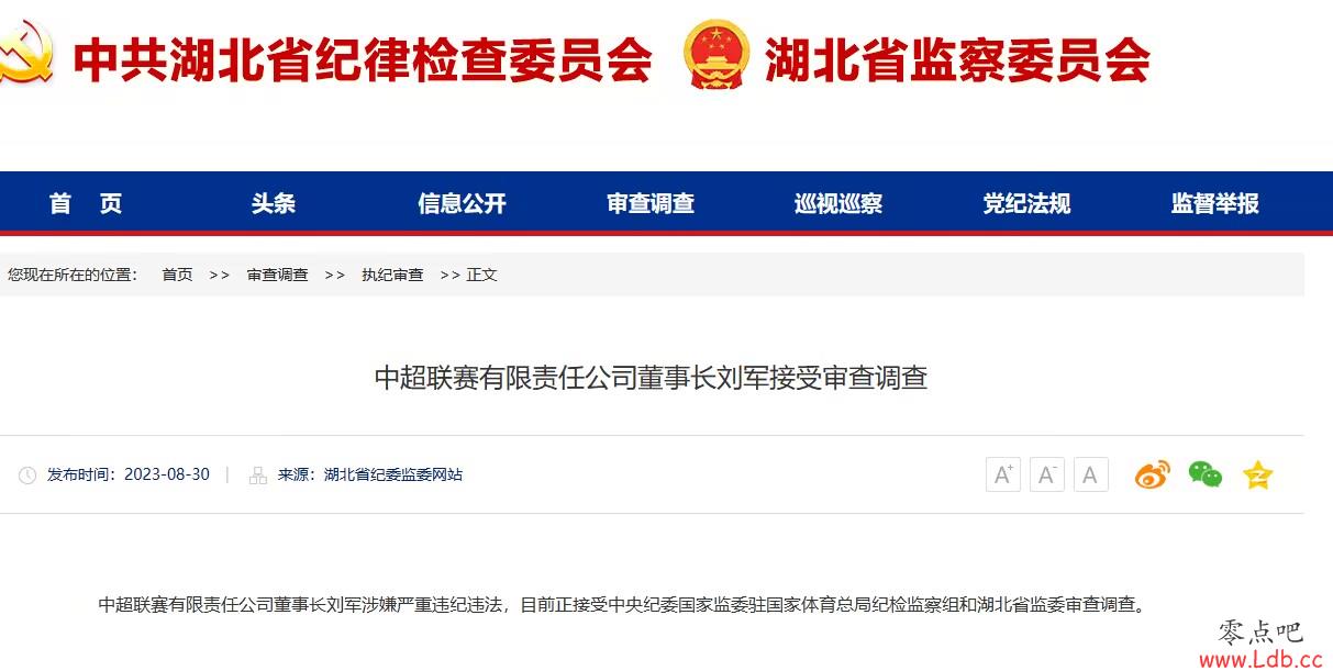 而刘军是2023年8月30日涉嫌严重违纪违法,接受中央纪委国家监委驻国家体育总局纪检监察组和湖北省监委审查调查。