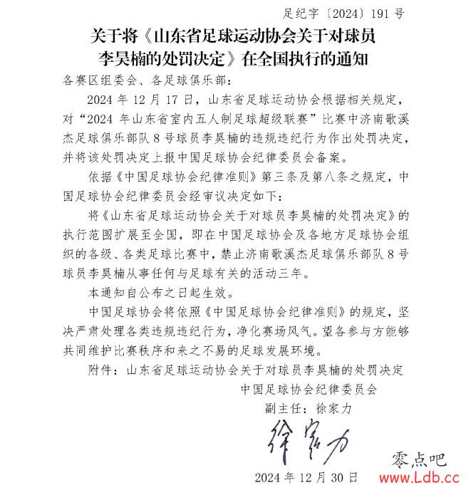 零点吧足球12月31日讯 山东足协发布公告,对五人制球员李昊楠禁足三年,禁足执行范围为山东足协组织的赛事,并将此事上报给了中国足协。中国足协今日发布公告,决定对李昊楠的禁足范围扩大至全国。
