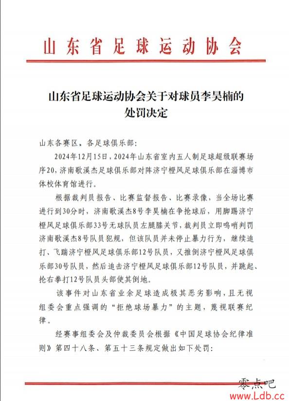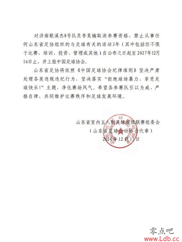 经赛事组委会及仲裁委员会根据《中国足球协会纪律准则》第四十八条、第五十三条规定做出如下处罚:对济南歌溪杰8号队员李昊楠取消参赛资格,禁止从事任何山东省足协组织的与足球有关的活动3年(其中包括但不限于比赛、培训、投资、管理或其他),自公布之日起至2027年12月16日止,并上报中国足球协会。山东省足协将依照《中国足球协会纪律准则》坚决严肃处理各类违规违纪行为,坚决落实“拒绝球场暴力,享受足球快乐!”主题,净化赛场风气。希望各参赛队引以为戒、严格自律,共同维护比赛秩序和足球发展环境。
