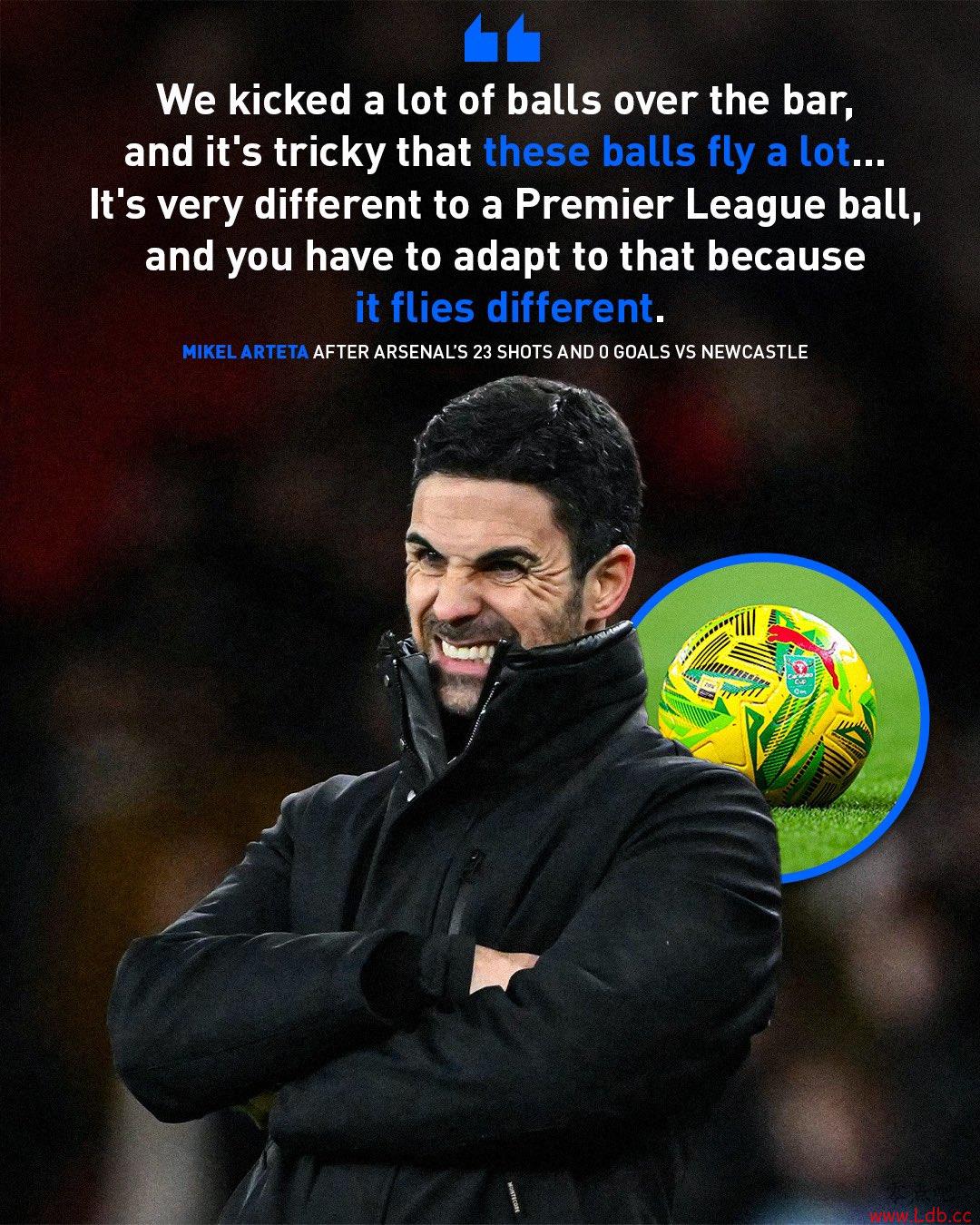 在联赛杯主场0-2不敌纽卡的赛后,阿尔特塔表示比赛的用球和英超用球有很大不同,联赛杯的用球飞得很远(This ball flies a lot),球队需要适应。