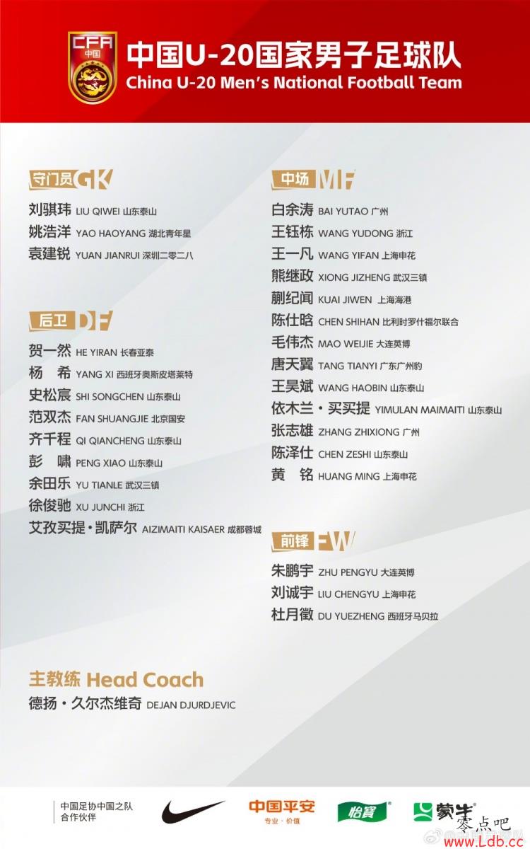 中场:张志雄(广州队)、陈泽仕(山东泰山)、王钰栋(浙江队)、蒯纪闻(上海海港)、毛伟杰(大连英博)