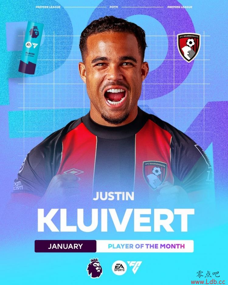 零点吧足球2月7日讯 英超官方宣布,伯恩茅斯边锋贾斯汀-克鲁伊维特当选英超1月最佳球员。