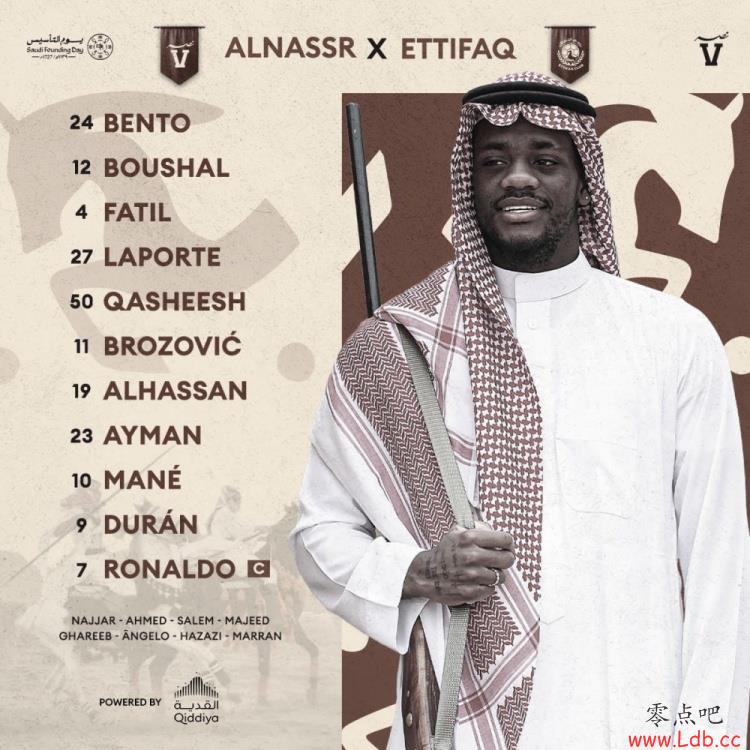 利雅得胜利首发:24-本托、12-布萨尔、4-法蒂尔、27-拉波尔特、50-卡谢什、11-布罗佐维奇、19-哈桑、23-艾曼、10-马内、9-杜兰、7-C罗