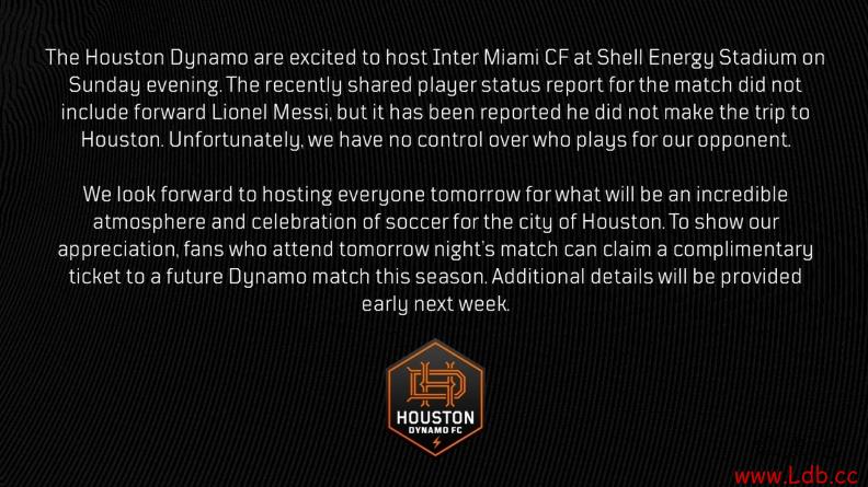 不幸的是,我们无法控制谁为我们对手出场。我们期待明天给大家带来一场令人置信的足球氛围。为了表达我们的感激之情,观看明晚比赛的球迷可以免费获得本赛季休斯顿迪纳摩的一张门票。详情将于下周初提供。