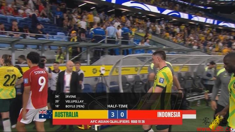 零点吧足球3月20日讯 北京时间3月20日17:10,世预赛亚洲区第三阶段C组第7轮,澳大利亚vs印尼。上半场,迪克斯失点,澳大利亚队3分钟内依靠博伊尔和韦卢皮莱打入两球,杰克逊-欧文再入一球。半场战罢,澳大利亚队暂3-0印尼队。