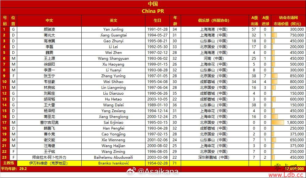 国足23人名单俱乐部分布:国安6人最多,申花、蓉城、泰山各4人