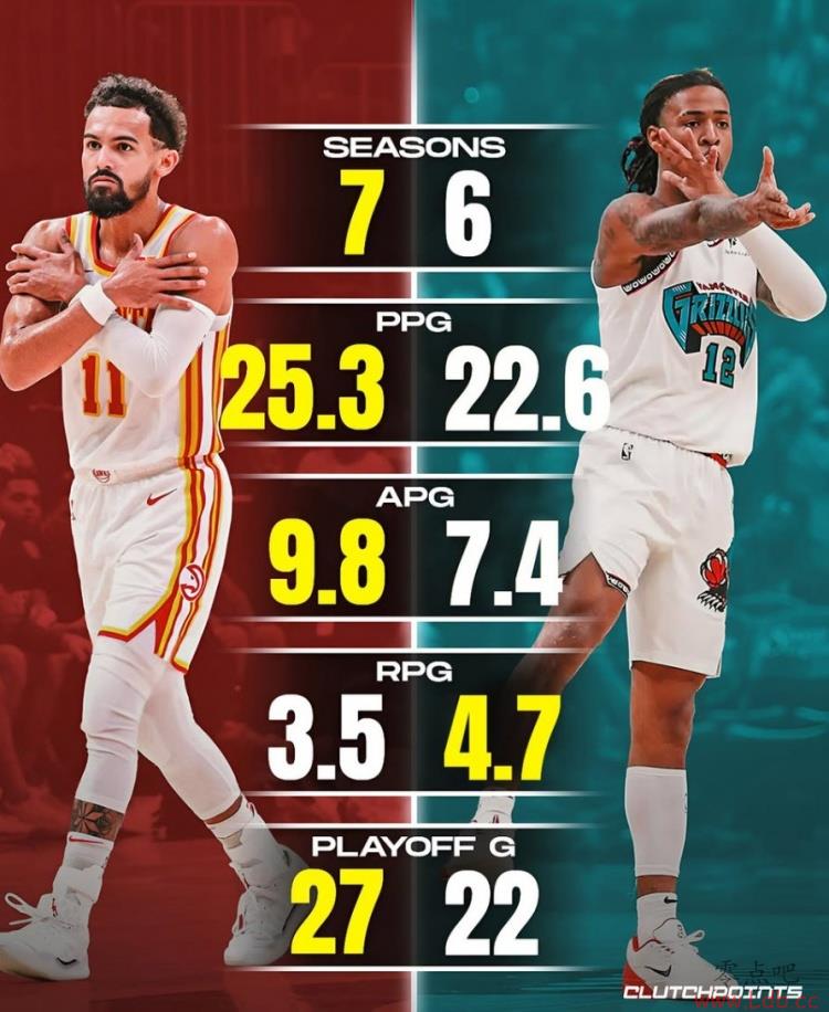 零点吧8月19日讯 今天,美媒ClutchPoints对比莫兰特和特雷-杨生涯数据。