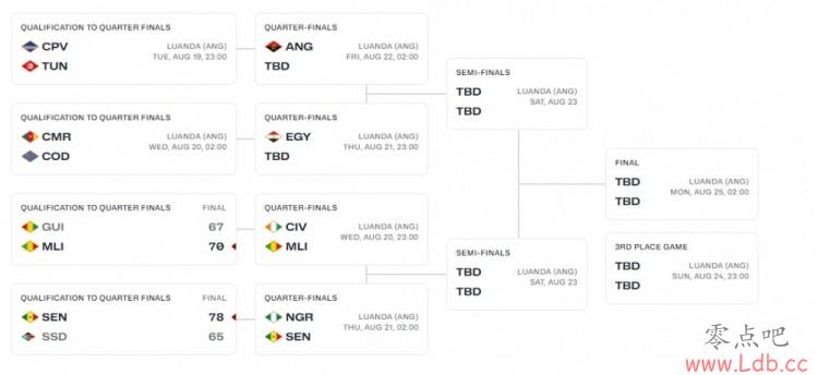零点吧8月19日讯 男篮非洲杯进入淘汰赛阶段,两组1/4决赛对阵率先出炉。