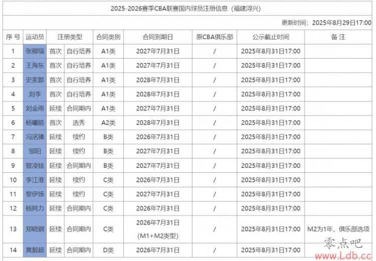 零点吧8月29日讯 CBA官网更新了福建男篮新赛季的国内球员注册信息,福建共注册了14人。