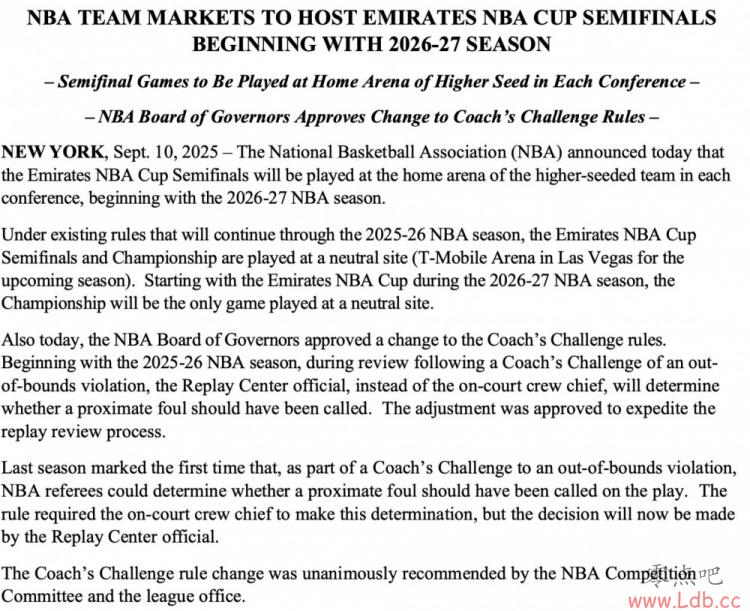 零点吧9月11日讯 NBA官方发布公告,新赛季NBA杯将作出相应调整。