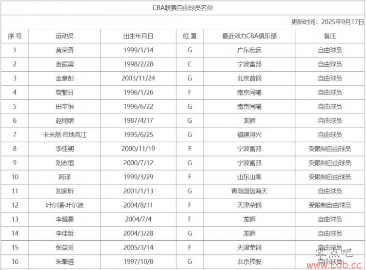 零点吧9月17日讯 今天,CBA官方更新了自由球员名单,黄荣奇在列。