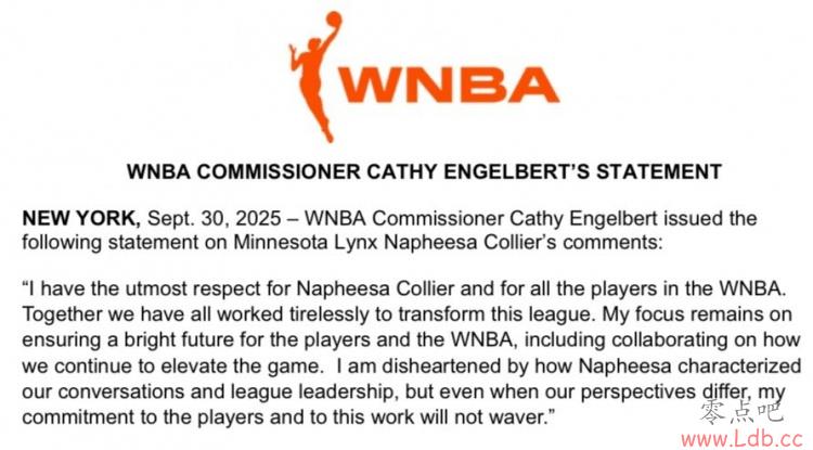 零点吧10月1日讯 WNBA总裁凯茜-恩格波特就科利尔的言论进行了官方声明回应。