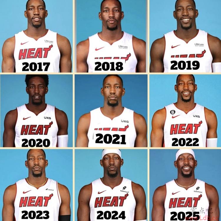 热火自媒体晒出了一张阿德巴约生涯9年媒体日的定妆照拼图