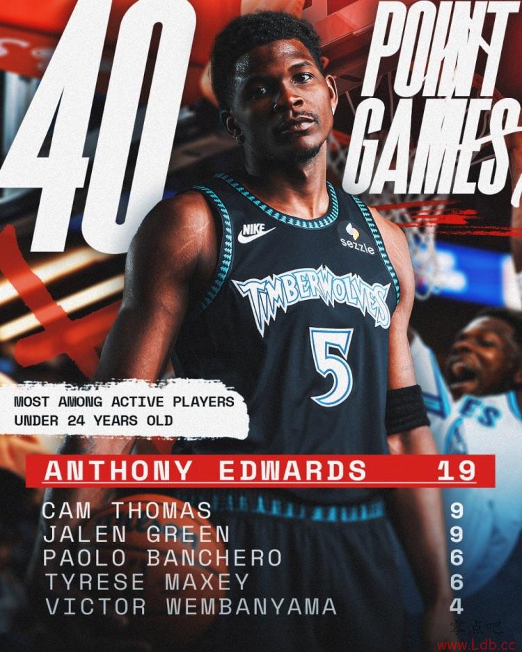 零点吧10月6日讯 NBA印尼分部社媒账号晒出了爱德华兹的得分表现。24岁的华子已经打出过19场40+得分的个人表演。