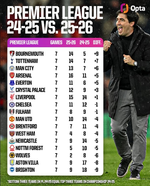 零点吧足球10月7日讯 根据OPTA的统计,伯恩茅斯是英超较上赛季同期拿分最多的球队,他们比上赛季同期多拿9分。