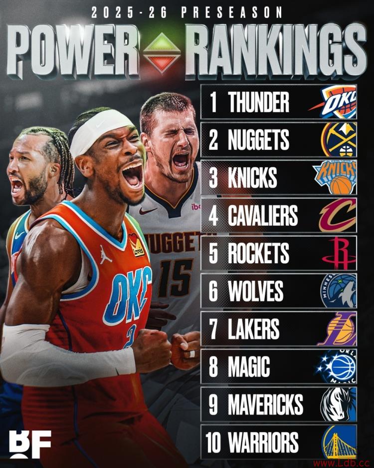 零点吧10月8日讯 美媒Basketball Forever在赛季正式开打之前评选出的季前球队实力榜TOP10。其中雷霆排在第一,掘金第二,尼克斯排在第三。