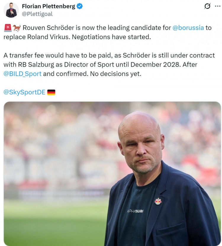 施罗德目前担任萨尔茨堡红牛总监,他的合同2028年12月到期,因此门兴需要为他支付转会费(补偿金),目前各方尚未做出最终决定。
