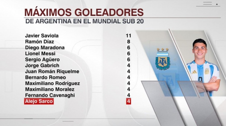世青赛历史阿根廷射手榜:萨维奥拉11球,老马梅西6球,萨尔科4球