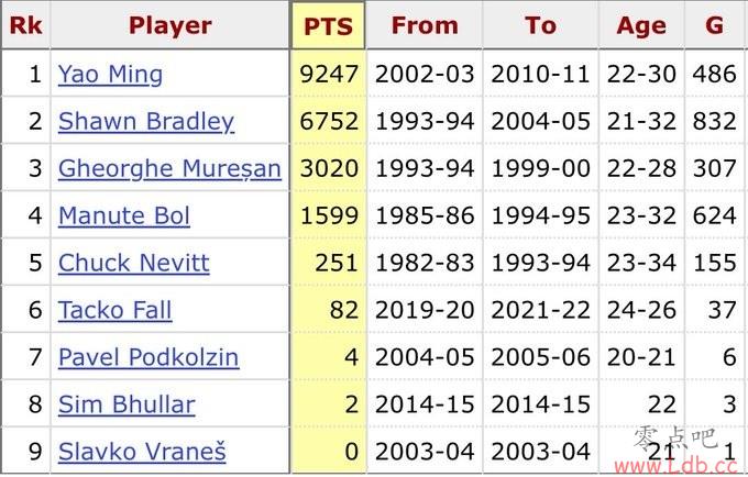 此前九位球员里得分最多的是姚明的9247分,其次是肖恩-布拉德利的6752分。