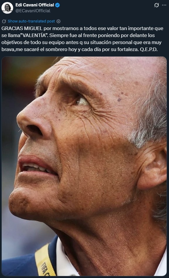 卡瓦尼写道:“感谢你米格尔,你向我们所有人展示了名为‘勇气’的宝贵品质。你总是冲锋在前,将全队的目标置于个人困境之上,尽管你正经历着无比艰难的时期。今天乃至未来的每一天,我都将为你展现的力量脱帽致敬,愿你安息。”