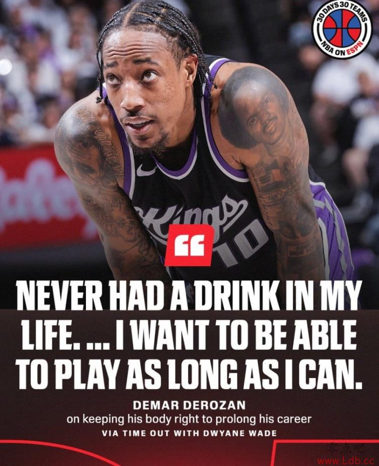 零点吧10月9日讯 近日,国王球星德罗赞在接受采访时表示,为了在职业生涯中保持健康,他从不喝酒。