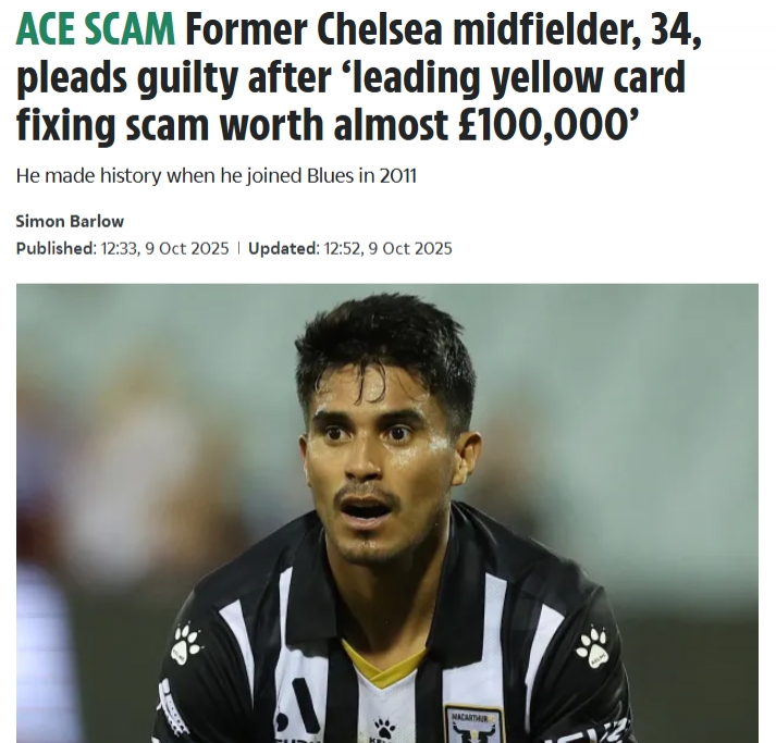 共获利10万镑!前切尔西中场承认在澳超参与假球,曾给队友5000镑