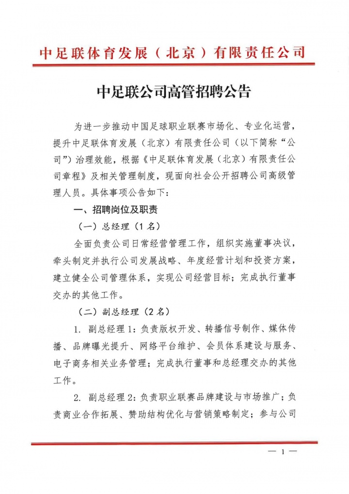 零点吧足球10月09日讯 中国足球职业联赛联合会发布高管招聘公告,招聘岗位为总经理(1名)、副总经理(2名)。