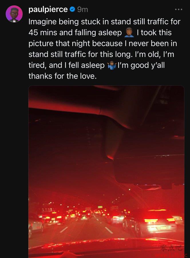 随后皮尔斯本人更新社媒Threads并晒出一张在驾驶位的照片澄清写道:“想象一下,被堵在完全停滞的车流里45分钟,结果我居然睡着了。那晚我拍了这张照片,因为我从未经历过如此漫长的堵车。老了,容易累,不小心就眯着了。不过我还好,谢谢大家的关心。”