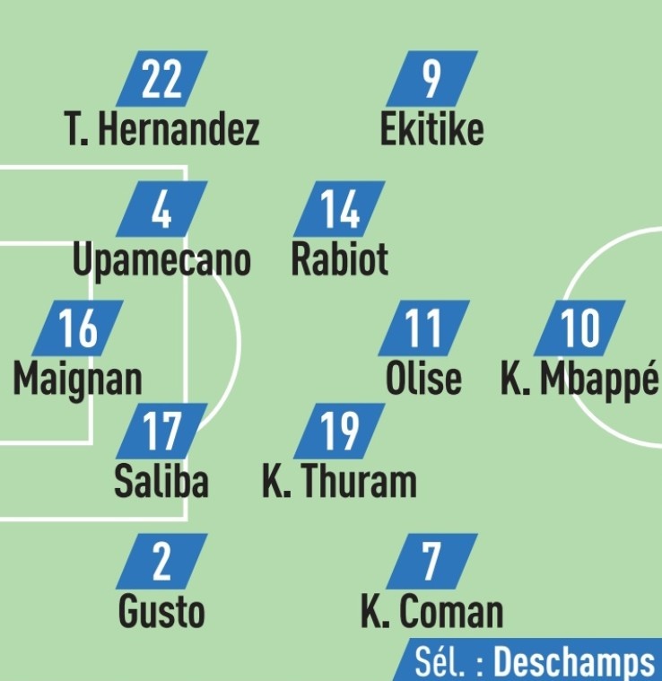 队报预测法国队首发:迈尼昂;特奥、于帕梅卡诺、萨利巴、古斯托;拉比奥特、K-图拉姆、埃基蒂克、奥利塞、科曼;姆巴佩