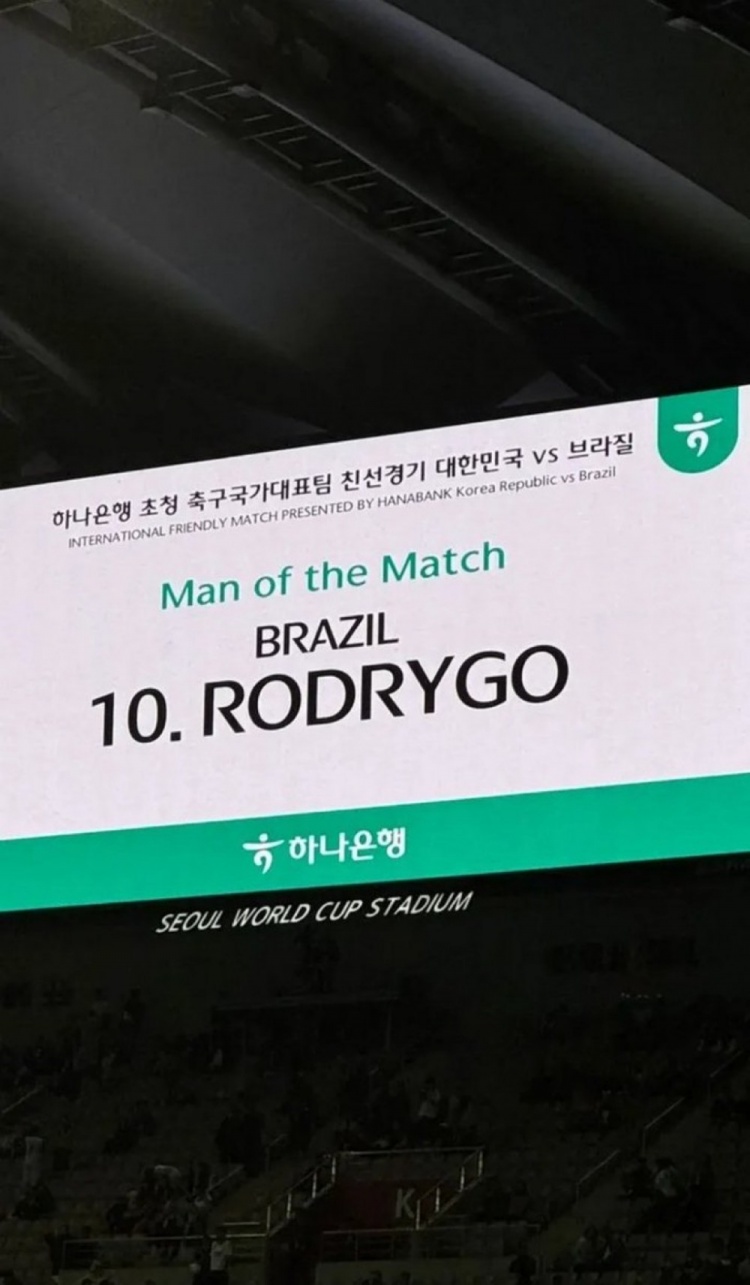 最终此役巴西5-0击败韩国,据比赛现场消息,罗德里戈当选此役最佳球员。