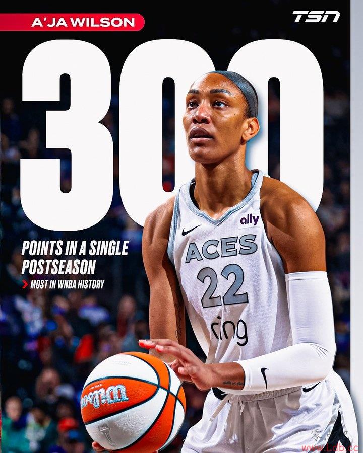 根据数据统计,加上这14分,阿贾-威尔逊本赛季季后赛总得分来到了305分,她成为了WNBA历史上第一位单次季后赛总得分超过300分的球员。
