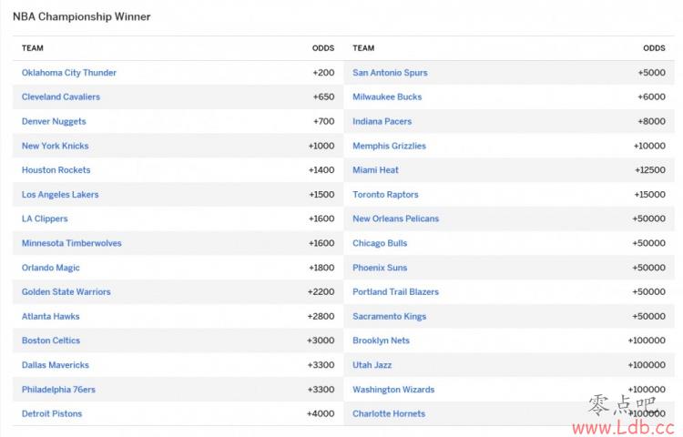 零点吧10月12日讯 今天,美媒ESPN更新了新赛季NBA球队的夺冠赔率,雷霆领跑,详情如下: