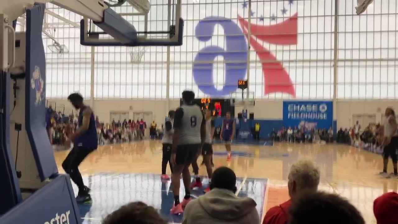 今日76人组织进行了一年一度的队内蓝白对抗赛,恩比德公开亮相并参与比赛