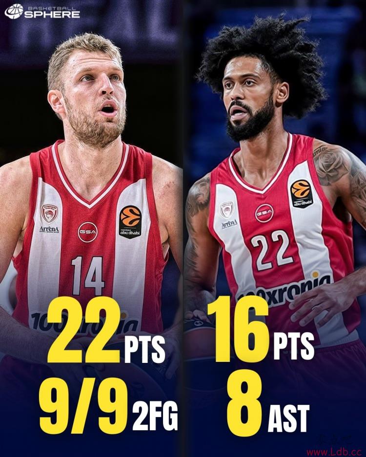 本场比赛奥林匹亚科斯球星韦津科夫14中10,其中两分球9中9,砍下22分6板2助,队友泰勒-多西拿到16分5板8助攻。