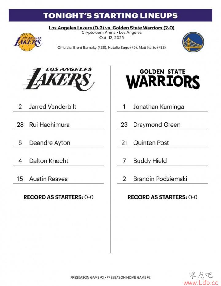 零点吧10月13日讯 今日9:30,勇士将做客湖人主场进行季前赛二番战。